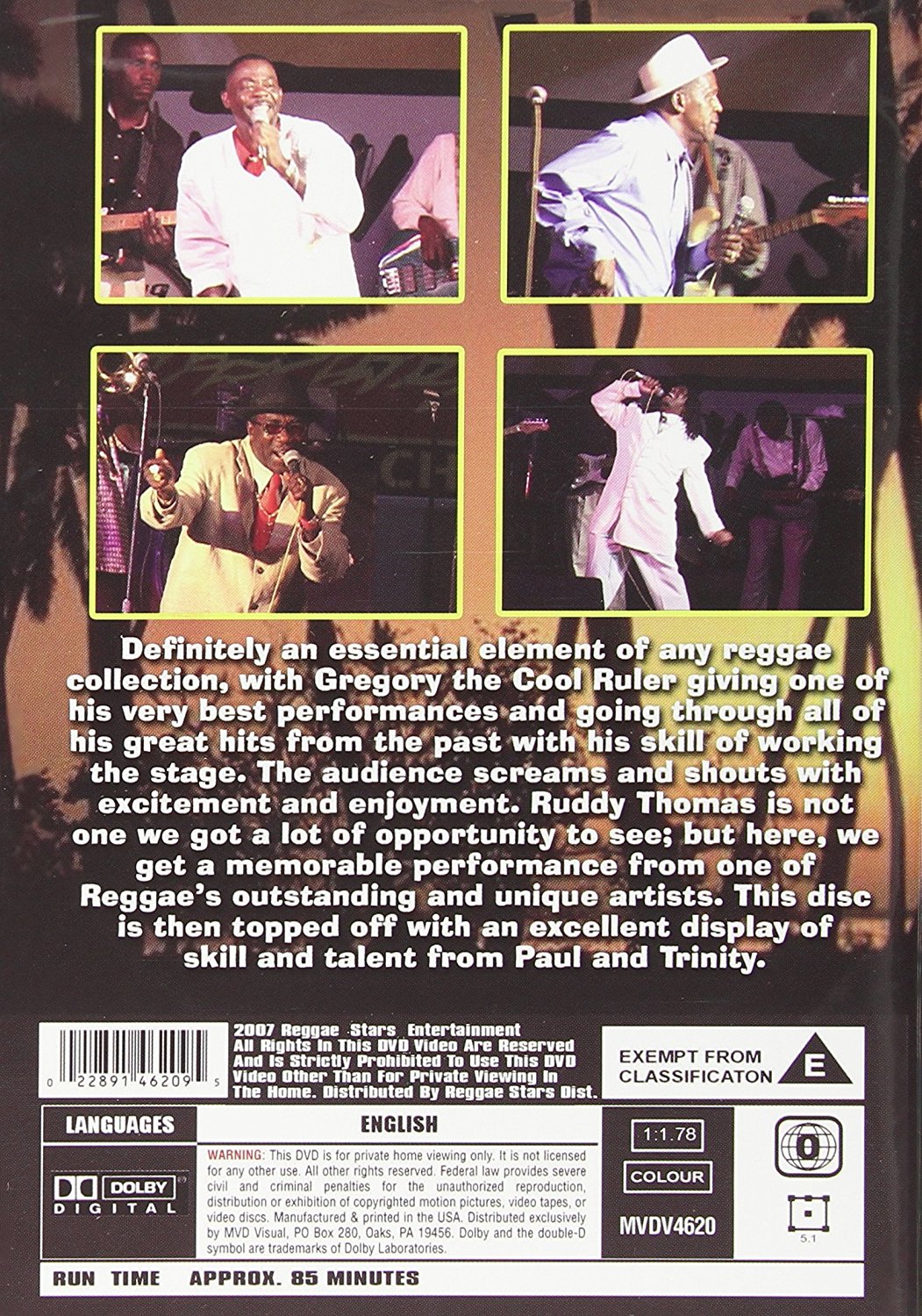 Definitely an essential element of any reggae collection with Gregory the Cool Ruler giving one of his very best performance, going through all his great hits from the past with his skill of working the stage; the audience screaming and shouting with excitement and enjoyment. Ruddy Thomas is not one we got a lot of opportunity to see but here we got a memoriable performance from one of reggae outstanding and unique artist. This disc is then top off with excellent display of skill and talent from Paul and Trinity.